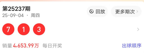 2025237期开奖号码为713,奇偶值为3奇;大小值为2小1大;012路走势为011路;跨度为6跨;和值11点;组六形态。