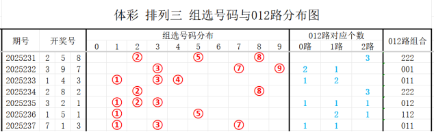 012路定义:0路为0369,1路为147,2路为258。请看开奖号对应012路分布图:
