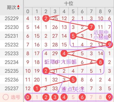 近7期(231~237)开奖号十位号码球分别为5、9、4、8、2、5、1,开奖号与上一期走出的振幅分别为2、4、5、4、6、3、4。231期走出5号中大数号码球,走出“2”的小幅度,232期走出9号大数号码球,走出“4”的中小幅度,233期走出4号中小数号码球,走出“5”的中大幅度,234期走出上期走出8号大数号码球,走出“4”的中小幅度,235期走出2号小数号码球,走出“6”的中大幅度,236期走出5号中大数号码球,走出“3”的中小幅度,237期走出1号小数号码球,走出“4”的中小幅度;从振幅大小及走势图的整体对应来看,中大振幅走在5~8之间较为适宜,中小振幅走在1~3之间较为适宜;结合走势图的上下对应及振幅大小分析,本期十位应重点关注号码球为0、2、3、4、6、9。