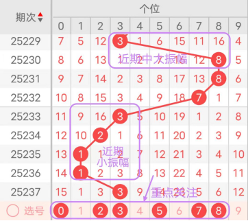 近7期(231~237)开奖号个位号码球分别为8、7、3、2、1、1、3,开奖号与上一期走出的振幅分别为0、1、4、1、1、0、2。231期走出8号大数号码球,走出“0”的小幅度,232期走出7号大数号码球,走出“1”的小幅度,233期走出3号中小数号码球,走出“4”的中小幅度,234期走出2号小数号码球,走出“1”的小幅度,235期走出1号小数号码球,走出“1”的小幅度,236期走出1号小数号码球,走出“0”的小幅度,237期走出3号中小数号码球,走出“2”的小幅度;从近期振幅大小的走势及大小走势来看,中大振幅走在4~5之间较为适宜,中小振幅走在0~3之间较为适宜;结合走势图的整体及大小走势分析,本期个位应重点关注号码球为0、2、3、5、7、8。