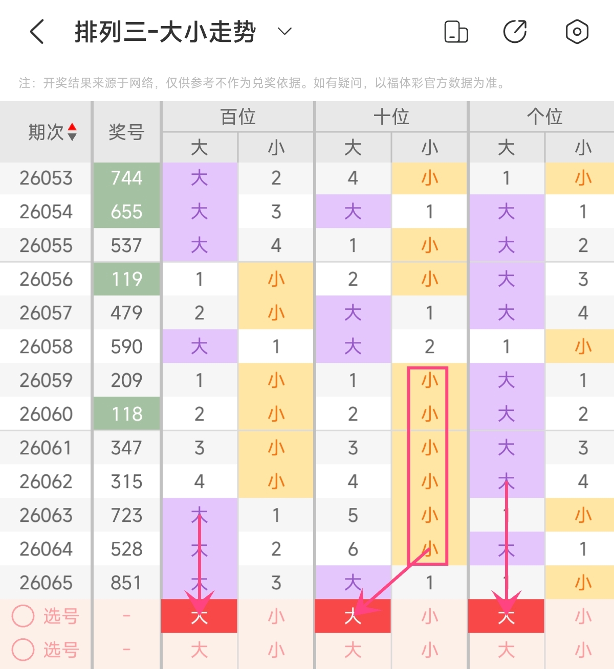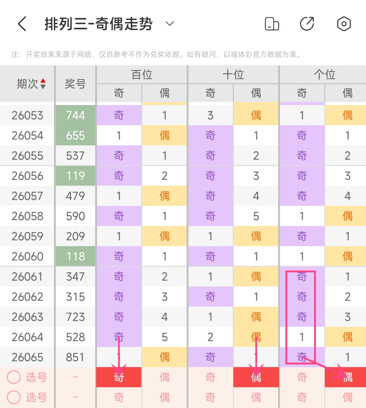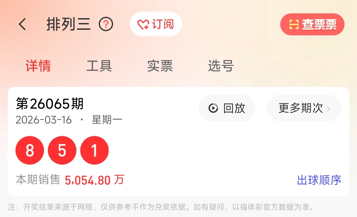 首先让我们回顾一下上期排列三第2026065期开奖号码为851,为组六形态,大小比为2:1,奇偶比为2:1,跨度为7,和值为14。