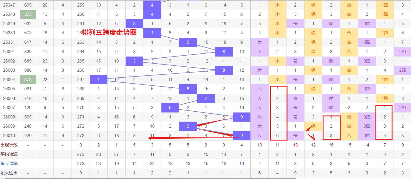 排列三 跨度分析:从上图可以看出近100期的跨度大小比约为48比52,跨度奇偶比约为46比54总体来看还是比较均衡的,但跨度大小之间有点差异。我们再从历史开出9跨后下一期5跨度数据来做参考。最近10期跨度大小比约为5:5期开出小数跨度过多返回大数跨度的概率更高一点。历史开奖近2期出9跨以后的走势为272期开出9跨后下一期走4跨走出5振幅,第287期开出9跨后下一期走5跨走4振幅第301期开出9跨后下一期开出7跨走出2个振幅。连续多期大振幅,近期排列三跨度走势观察,跨度2已持续遗漏较长时间,历史数据表明,冷跨在达到一定遗漏阈值后,通常具备较强的回补动能,且一旦回补,可能出现短期内的密集出现,因此当前跨度2值得重点关注其解冻信号。另一方面,跨度5近期表现活跃,呈现明显热态,热跨往往具有延续性,短期内仍有继续开出的可能,需持续防范。综合来看,在追踪跨度2这一冷号回补机会的同时,也需警惕跨度5热号的惯性延伸,出9跨度后容易走出1到6个跨度振幅的对称形态,跨度走出1到6个振幅看好的跨度有2457跨,所以第2026011期排列三跨度推荐2457跨。本文由一起彩钱是生命动力所著,请勿转载