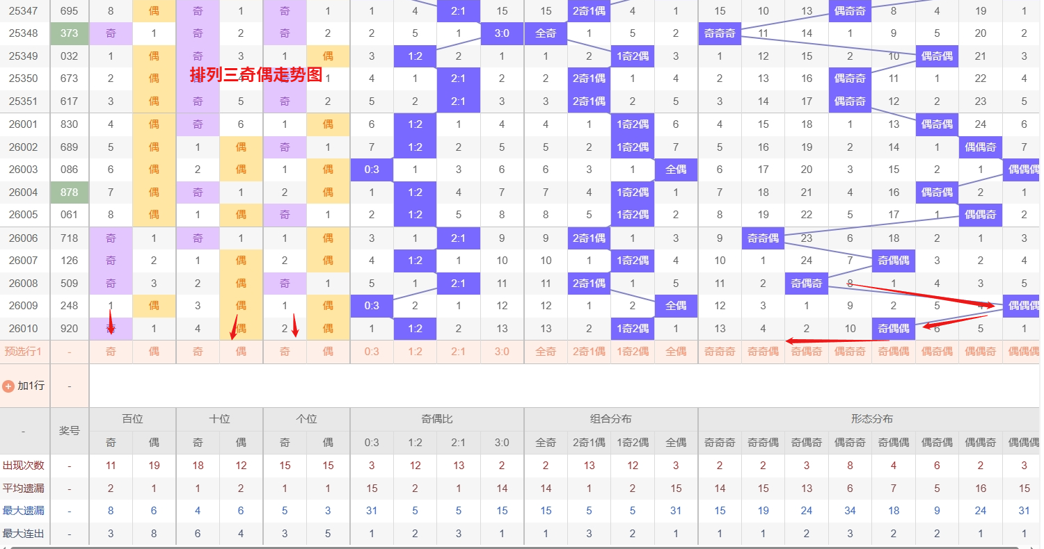 排列三 奇偶分析:从上图可以看出排列三100期内百位奇偶比约为48比52,十位奇偶比为55比45,个位奇偶比为53比47,个位的比值比较均衡,但是十位的比值偏差就有点大,历史奇偶形态近2期开出奇偶偶后下一期的走势为,第273期开出奇偶偶后274期开偶奇偶, 第286期开出奇偶偶后第287期开奇奇奇,第306期开出奇偶偶后第307期开偶奇奇,近期排列三奇偶走势来看,偶奇偶明显处于热态,出现频率较高且分布集中,这种强势组合往往具备一定的走势惯性,短期内确实存在连续开出的可能性,值得继续追踪关注。与此同时,奇奇奇已遗漏较长时间,进入冷态区间,从历史数据来看,任何冷态组合在达到一定遗漏极值后,都会面临强烈的回补压力,因此尽管当前热度集中在偶奇偶,也须对奇奇奇的突然解冻保持警惕。所以排列三2026011期奇偶形态推偶奇偶与奇奇奇。本文由一起彩钱是生命动力所著,请勿转载