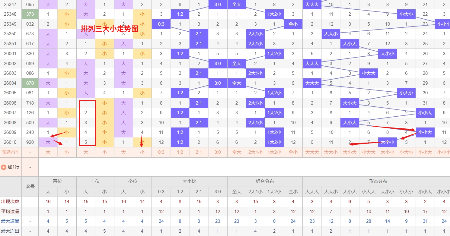 排列三 大小形态分析:从大小走势图上可以看出排列三100期内百位大小比约为52比48,十位大小比约为45:55,个位大小比约为54比46,除了个位和百位奇数比偶数多,十位偶数比奇数多。历史数据近2期开出大小小下一期的走势为,第282期开出大小小第283期开小大小。第297期开出大小小后第298期开大大大,第301期开出大小小后302期开小大大。近期排列三大小走势分析,“小大小”目前处于温态,但出现频率有所上升,走势图上呈现蓄力上行的态势,通常这类温号在积累一定动能后,有较大概率转为热号,值得密切关注其后续发展。另一方面,“小大大”近期表现强势,已形成明确的热态格局,热号往往具有惯性延续的特征,短期内仍有较大概率开出,所以排列三第2026011期大小形态推荐小大大防小大小。本文由一起彩钱是生命动力所著,请勿转载