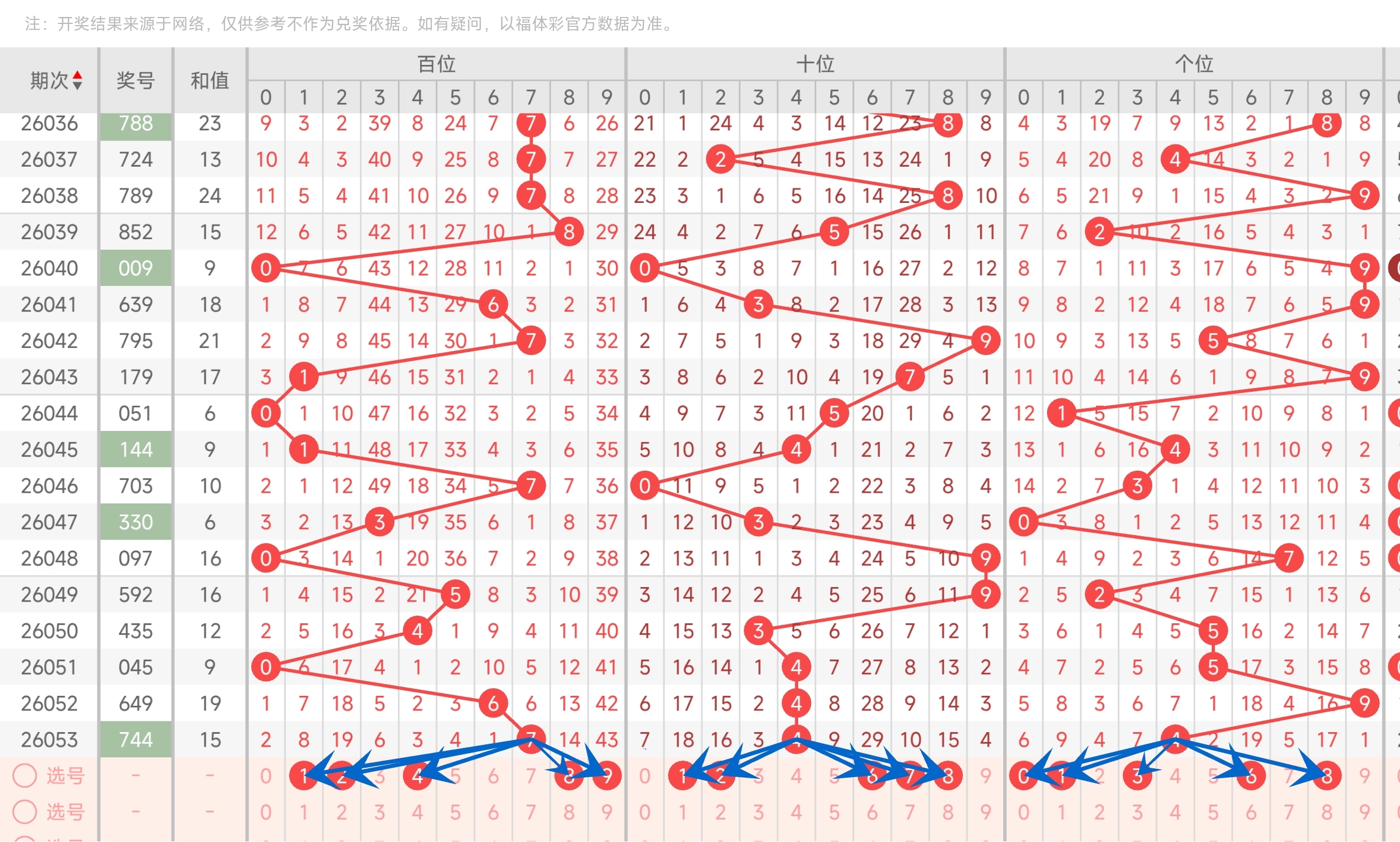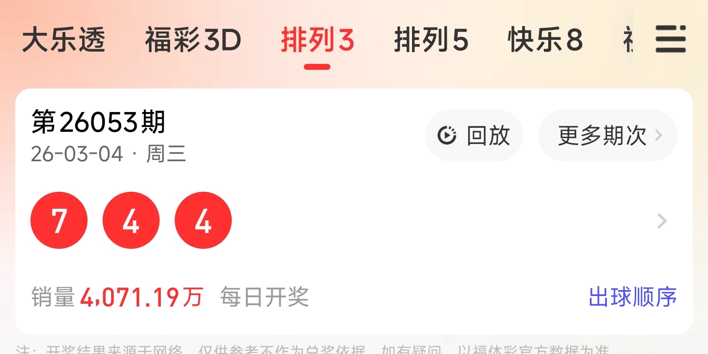 上期排列3开出744,和尾为5,跨度为5,奇偶比为1:2,大小比为1:2012路个数对比为0:3:0