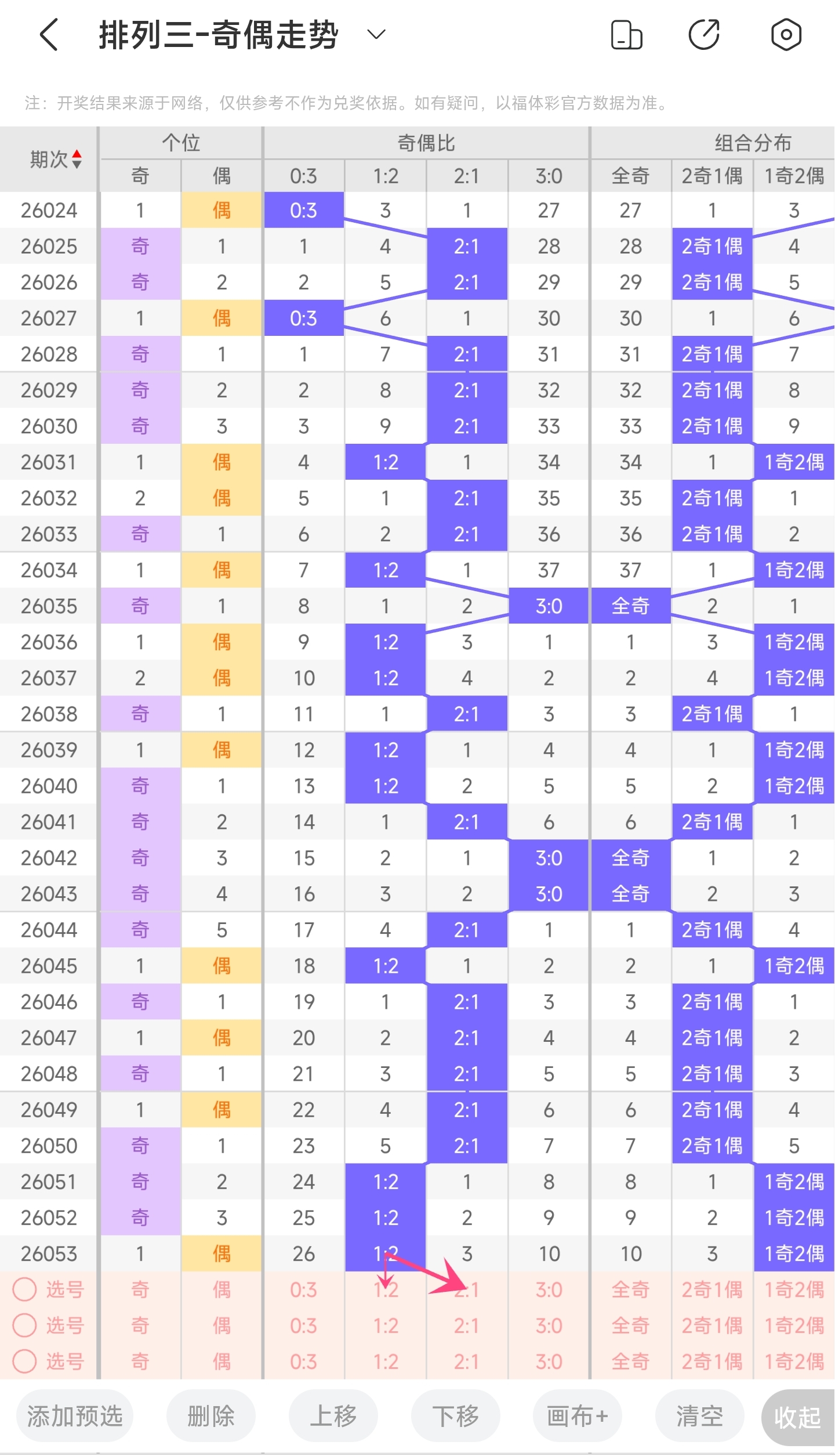 上期开出了1:2的奇偶比。往前一期是1:2奇偶比。通过分析奇偶走势图,近30期内开出1:2奇偶比的次数是10次,开出2:1奇偶比的次数是15次,3:03次,0:32次。和前一期相比,1:2次数变多,2:1次数变少。通过走势图分析,上期开1:2奇偶比,本期还是看好1:2奇偶比。所以推测本期可能开1:2奇偶比,其次是2:1奇偶比,最后是3:0或者0:3奇偶比。