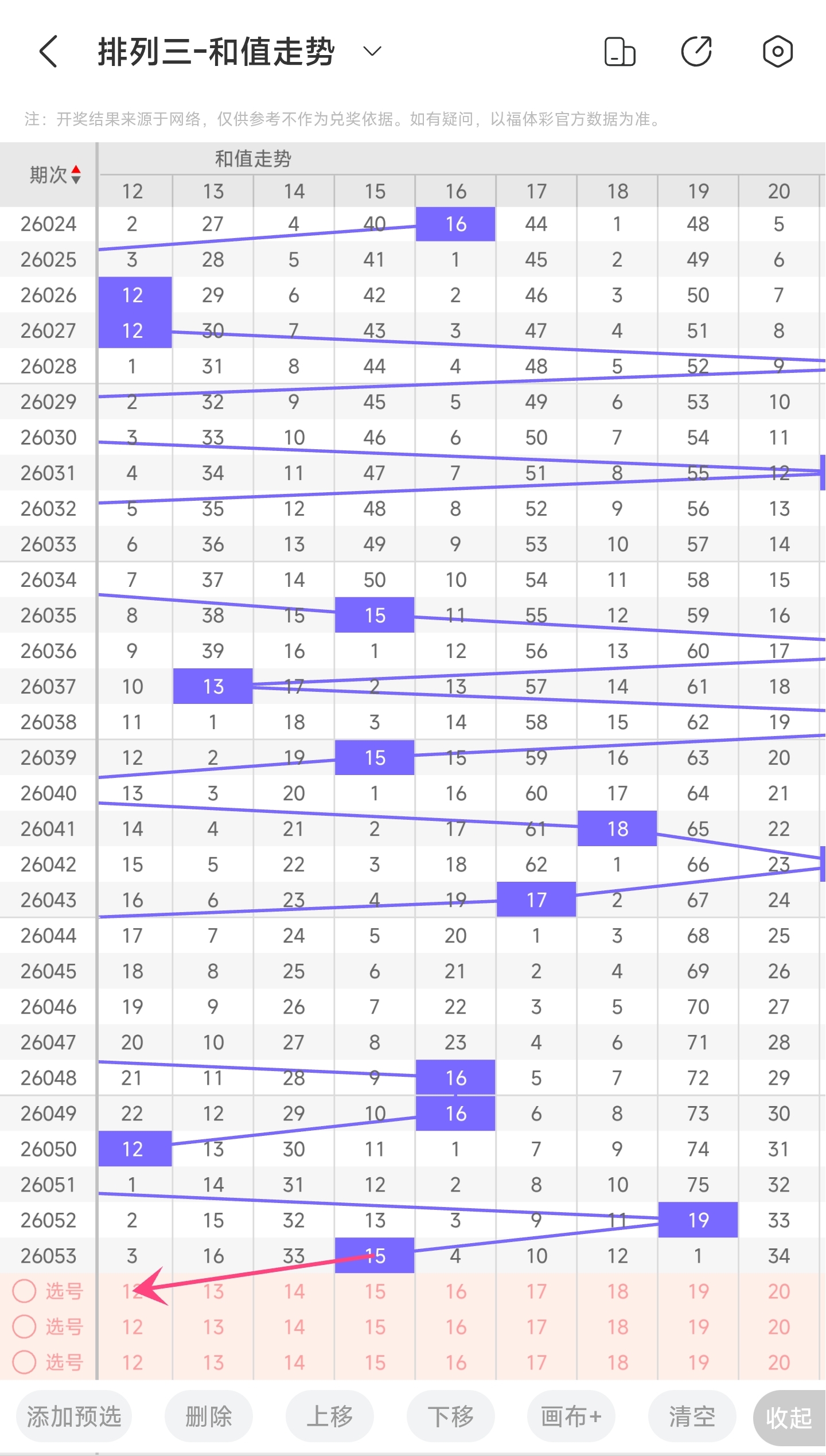 上期和值为15,往前一期和值为19,趋势往左移动,偏移量为4。通过走势图分析,15和值是近30期内开出中间的和值,上升空间和下降空间差不多,但本期比较看好和值变小。因此推测本期趋势是往左的,和值会变小,小概率往右,和值变大。