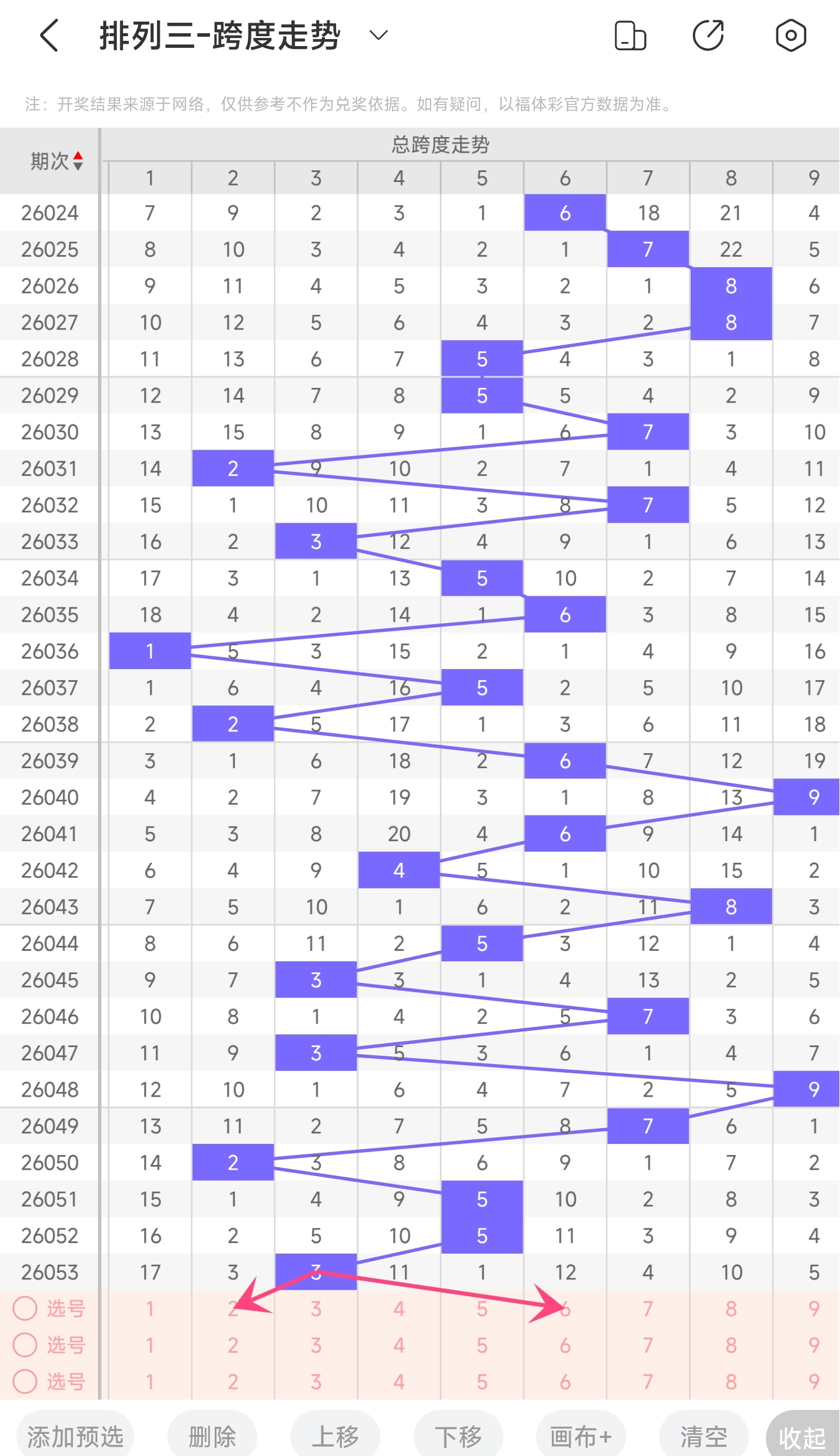 上期跨度为3,往前一期跨度是5,趋势往左移动,偏移量为2。跨度值3时,跨度值是近30期开出比较小的值。通过走势图分析,目前的趋势是大概率往右,小概率往左。所以推测本期跨度可能为25678等跨度。