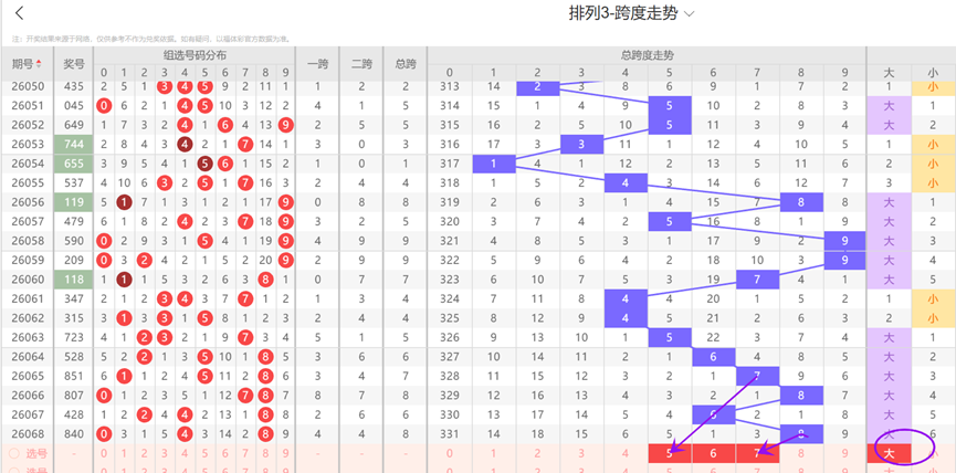 通过观察跨度及跨度属性走势可以发现:近10期内跨度开出大数号码后,下期容易连开大数号码,上期跨度开出了大数号码8,因此本期跨度选号时应该主要考虑大数号码,再结合上述走势图看,本期跨度看好567等号码。