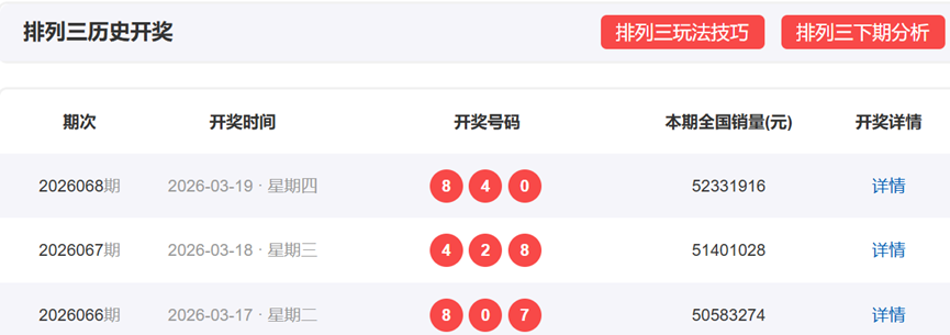 体彩排列3上一期,开奖号码为840,形态为组六,奇偶比为0:3,012路数值表现为210,和值12,和尾2,跨度8。