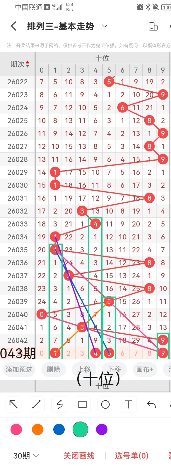 我们结合上图中画线的思路分析,号码1与前几期开出的号码呈斜三连的走位且呈隔九期回补的走势,跨度4;号码2与前几期开出的号码呈斜三连的走势且呈隔三期回补的走位,跨度为3;号码4与前几期开出的号码呈斜三连的走位且呈隔五期回补的走势,跨度1;号码6与前几期开出的号码呈斜三连的走势且呈隔八期回补的走位,跨度是1。综上所述,小梁推荐个位的号码是:1、2、4、6。