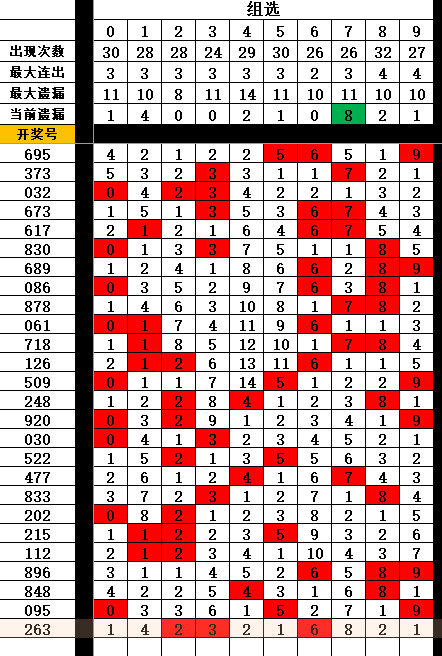 4:组选排序(近100期)开奖号组选各位0-9排序为8054129673 *首选*>>>80541 *次选*>>>29673
