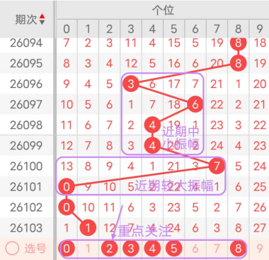 近7期(097~103)开奖号个位号码球分别为6、4、4、7、0、0、1,开奖号与上一期走出的振幅分别为3、2、0、3、7、0、1。097期走出6号中大数号码球,走出“3”的中小幅度,098期走出4号中小数号码球,走出“2”的小幅度,099期走出4号中小数号码球,走出“0”的小幅度,100期走出7号大数号码球,走出“3”的中小幅度,101期走出0号小数号码球,走出“7”的大幅度,102期走出0号小数号码球,走出“0”的小幅度,103期走出1号小数号码球,走出“1”的小幅度;从近期振幅大小的走势及大小走势来看,中大振幅走在4~7之间较为适宜,中小振幅走在1~3之间较为适宜;结合走势图的整体及大小走势分析,本期个位应重点关注号码球为0、2、3、4、5、8。
