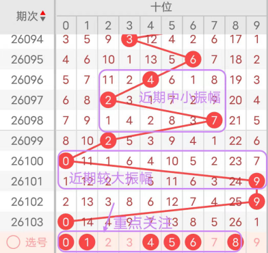 近7期(097~103)开奖号十位号码球分别为2、7、2、0、9、9、0,开奖号与上一期走出的振幅分别为2、5、5、2、9、0、9。097期走出2号小数号码球,走出“2”的小幅度,098期走出7号大数号码球,走出“5”的中大幅度,099期走出2号小数号码球,走出“5”的中大幅度,100期走出0号小数号码球,走出“2”的小幅度,101期走出9号大数号码球,走出“9”的小幅度,102期走出9号大数号码球,走出“0”的小幅度,103期走出9号大数号码球,走出“9”的大幅度;从振幅大小及走势图的整体对应来看,中大振幅走在5~8之间较为适宜,中小振幅走在0~4之间较为适宜;结合走势图的上下对应及振幅大小分析,本期十位应重点关注号码球为0、1、4、5、6、8。