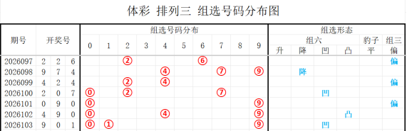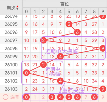 近7期(097~103)开奖号百位号码球分别为2、9、4、2、0、4、9,开奖号与上一期走出的振幅分别为4、7、5、2、2、4、5。097期走出9号大数号码球,走出“7”的大幅度,098期走出9号大数号码球,走出“7”的大幅度,099期走出4号中小数号码球,走出“5”的中大幅度,100期走出2号小数号码球,走出“2”的小幅度,101期走出0号小数号码球,走出“2”的小幅度,102期走出4号中小数号码球,走出“4”的中小幅度,103期走出9号大数号码球,走出“5”的中大幅度;从振幅大小及走势图的整体形势来看,中大幅度走在5~9之间较为适宜,中小幅度走在1~4之间较为适宜;结合走势图的整体及大小走势分析,本期百位需重点关注号码球为0、3、4、5、6、8。