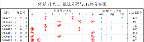 近7期(097~103)开奖号与012路组合分别为226(022)、974(011)、424(112)、207(012)、090(000)、490(001)、901(001),上期开奖号为001路组合,根据整体走势分析,本期看好的012路组合有:002、012、011,防022、001、222路组合。