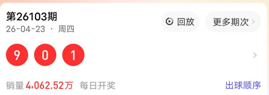 2026103期开奖号码为901,奇偶值为1偶2奇;大小值为2小1大;012路走势为001路;跨度为9跨;和值10点;组六形态。