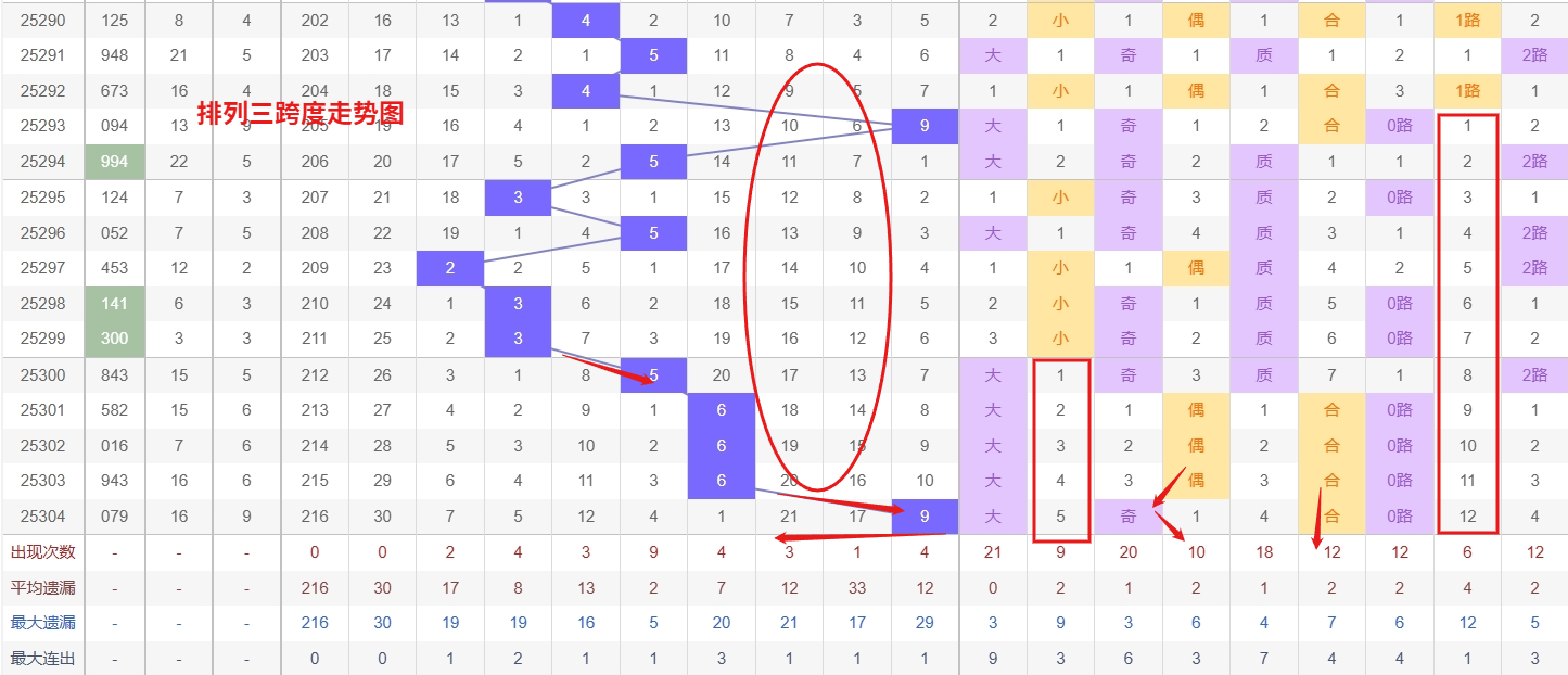 排列三 跨度分析:从上图可以看出近100期的跨度大小比约为52比48,跨度奇偶比约为46比54总体来看还是比较均衡的,但跨度大小之间有点差异。我们再从历史开出9跨后下一期7跨度数据来做参考。最近10期跨度大小比约为5:5期开出小数跨度过多返回大数跨度的概率更高一点。历史开奖近2期出9跨以后的走势为225期开出9跨后下一期走8跨走出1振幅,第281期开出9跨后下一期走7跨走出2振幅第285期开出9跨后下一期开出5跨走出4个振幅。连续多期小振幅。近期的排列三跨度走势来看,一个非常明显的特征是跨度5正处于热出状态,热号往往具有持续的惯性,因此在接下来的几期内,须重点防范其再次开出,避免因追逐冷号而错过眼前的热点。与此同时,跨度7和跨度8已经进入了较长的遗漏周期,形成了显著的冷态;从概率均衡的“回补效应”来看,任何一个跨度都不可能永远沉默,冷态持续时间越长,其反弹回补的动能也就越强,尤其像跨度7和8这类理论出现频率并不算低的跨度,值得我们开始密切关注其解冻信号。综合而言,一个较为稳妥的策略是采取“防热追冷”的思路:在短期内继续防守跨度5的热势延续,同时可以逐步开始对跨度7和8进行跟踪, 综合以上分析后得出,本期预计跨度遵从历史会走出小振幅,出9跨度后容易走出2到4个跨度振幅的对称形态,跨度走出2到4个振幅看好的跨度有1578跨,所以第2025305期排列三跨度推荐1578跨。