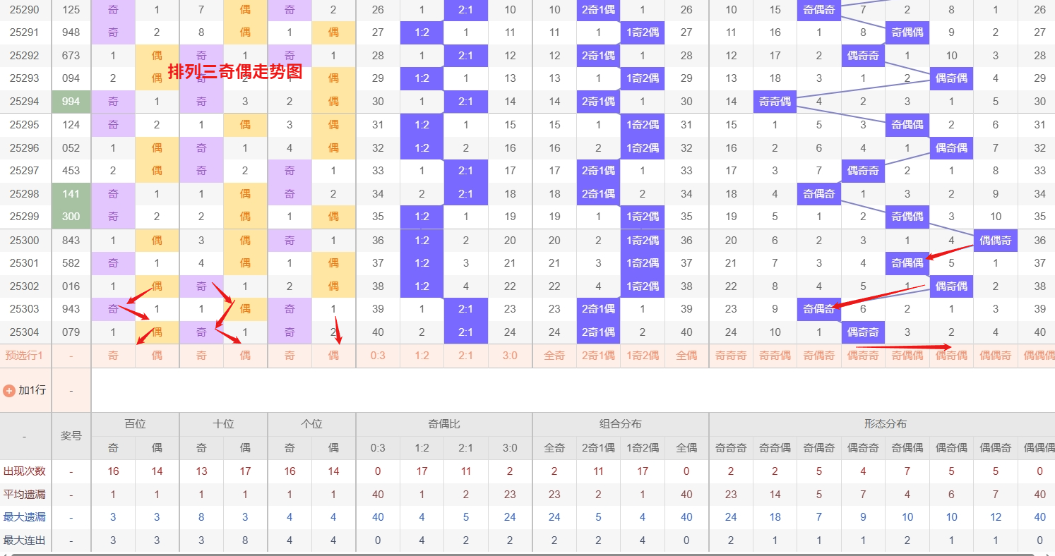 排列三 奇偶分析:从上图可以看出排列三100期内百位奇偶比约为49比51,十位奇偶比为47比53,个位奇偶比为45比55,百位的比值比较均衡,但是个位的比值偏差就有点大,历史奇偶形态近2期开出偶奇奇后下一期的走势为,第228期开出偶奇奇后229期开偶偶奇, 第236期开出偶奇奇后第237期开偶偶偶,第241期开出偶奇奇后第242期开偶奇偶,近期的排列三奇偶走势分析,“偶偶偶”这一形态已经遗漏长达40期,远超其理论出现周期,形成了极为显著的冷态。从概率回补的规律来看,这种极端冷态不可能无限期持续,其反弹开出的动能正在急剧累积,近期须将其作为重点回补对象进行密切关注,极有可能在短期内实现解冻。与此同时,“偶偶奇”组合正处于热出阶段,热形态往往具备一定的持续惯性,所以排列三2025305期奇偶形态推偶偶奇与偶偶偶。
