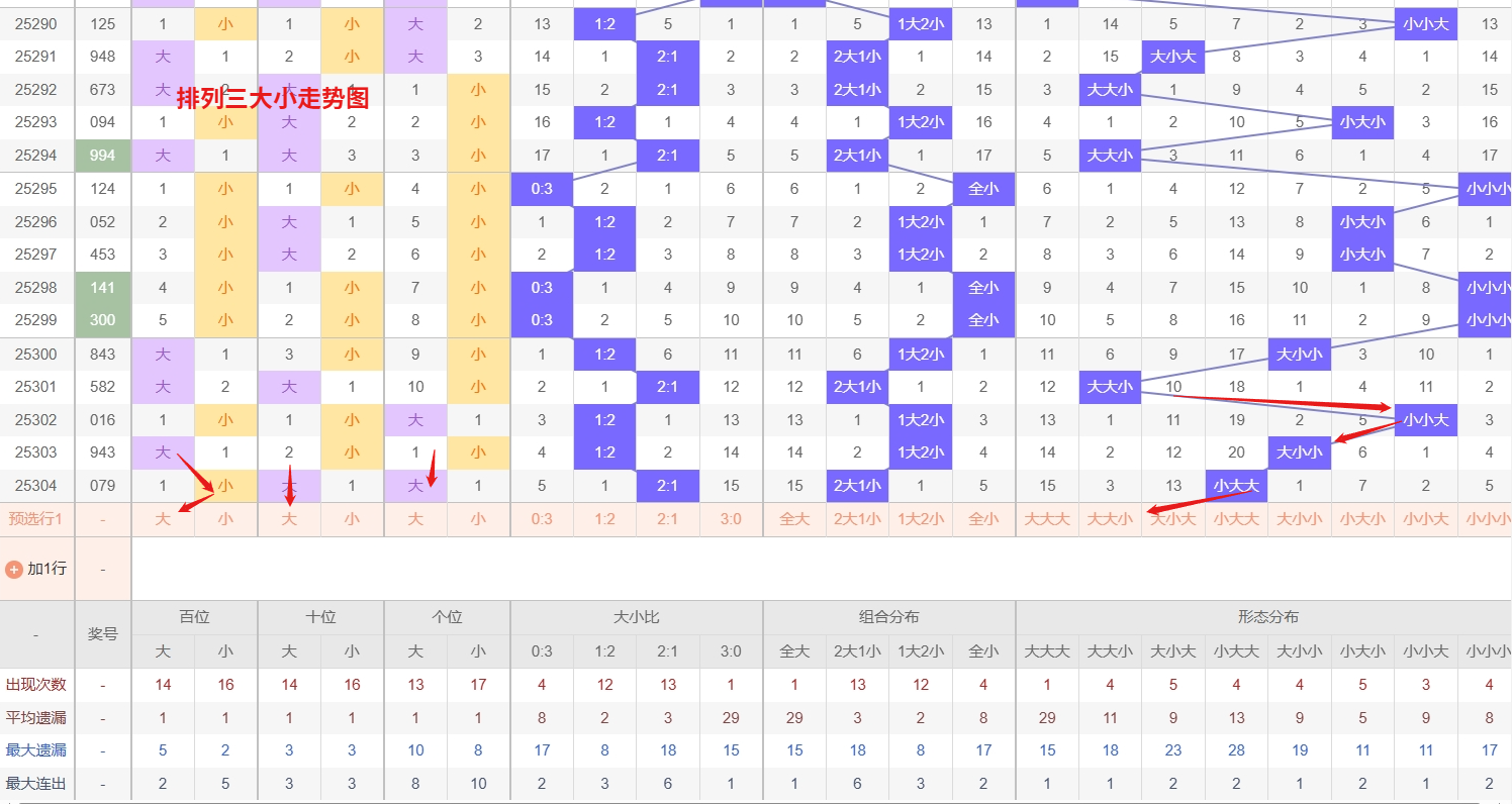 排列三 大小形态分析:从大小走势图上可以看出排列三100期内百位大小比约为46比54,十位大小比约为48:52,个位大小比约为55比45,除了个位奇数比偶数多,十位和百位是偶数比奇数多。历史数据近2期开出小大大下一期的走势为,第224期开出小大大第225期开大小大。第237期开出小大大后第238期开小小大,第246期开出小大大后247期开大大大。近期的排列三大小走势分析,“大小大”组合正呈现明显的热态趋势,此类热号形态往往具备较强的走势惯性,短期内连续开出的可能性较高,需作为防守重点持续关注。与此同时,“大大大”这一全大形态已遗漏较长周期,逐渐进入冷态区间,从概率均衡的角度看,冷态回补的动能正不断积累,尤其像此类理论概率固定的形态,一旦进入极端遗漏后,其反弹开出所带来的机会不容忽视。所以排列三第2025305期大小形态推荐大小大防大大大。