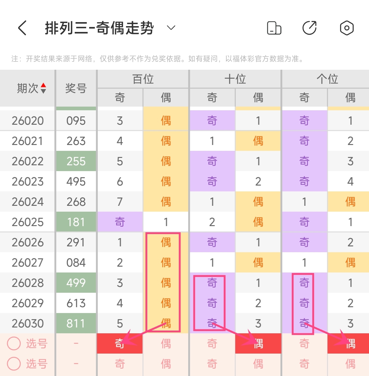 预计本期可关注奇偶比1:2,偶数号码占优组合 。本期奇偶形态可重点关注:奇偶偶。