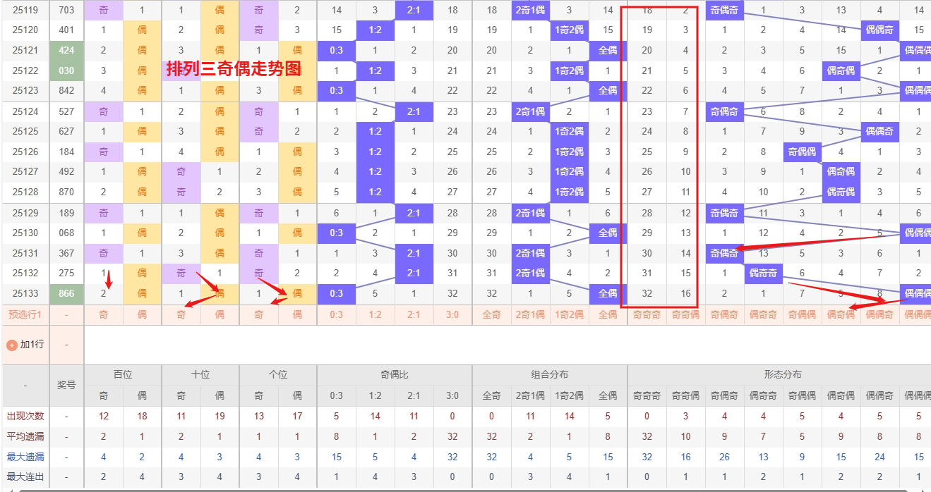 排列三 奇偶分析:从上图可以看出排列三100期内百位奇偶比约为55比45,十位奇偶比为53比47,个位奇偶比为46比54,十位的比值比较均衡,但是百位的比值偏差就有点大,历史奇偶形态近2期开出偶偶偶后下一期的走势为,第035期开出偶偶偶第036期开奇奇奇, 第041期开出偶偶偶后第042开偶奇偶,第055期开出偶偶偶后第056期开偶偶奇。从近期开奖数据来看,奇奇奇组合出现频率较低,冷态明显,需重点防范其回补;而偶奇偶组合表现活跃,热度较高,短期内仍有连开的可能。投注时采取"追热防冷"策略,在关注偶奇偶延续性的同时,适当防守全奇组合的反弹。奇偶走势存在一定轮动规律, 所以排列三2025134期奇偶形态推奇奇奇与偶奇偶。本文由一起彩钱是生命动力所著,请勿转载
