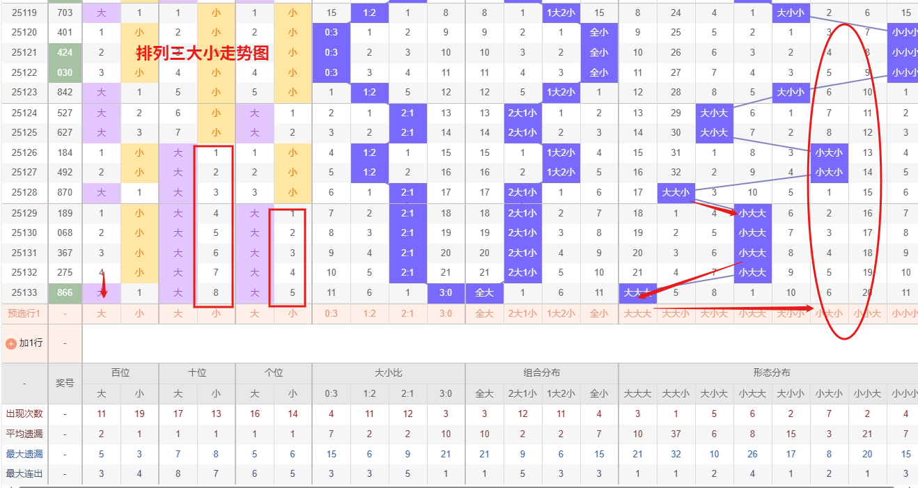 排列三 大小形态分析:从大小走势图上可以看出排列三100期内百位大小比约为46比54,十位大小比约为49:51,个位大小比约为55比45,除了百位和十位奇数比偶数多,个位是偶数比奇数多。历史数据近2期开出大大大下一期的走势为,第045期开出大大大第046期开大大小。第051期开出大大大后第052期开大小小,第066期开出大大大后067期开小小大。可以看出开出大大大的时候,结合遗漏数据再加上开出大大大形态后容易进行下一个类型变化。观察近期开奖数据,"大大小"和"小小大"组合已多期未出,遗漏值持续攀升,进入冷态区间,需重点防范其回补。投注时采取"冷热均衡"策略,在关注热门组合的同时,对这两个冷门组合进行针对性防守。需注意的是,大小走势虽存在一定的周期性特征,所以排列三第2025134期大小形态推荐小小防小小本文由一起彩钱是生命动力所著,请勿转载