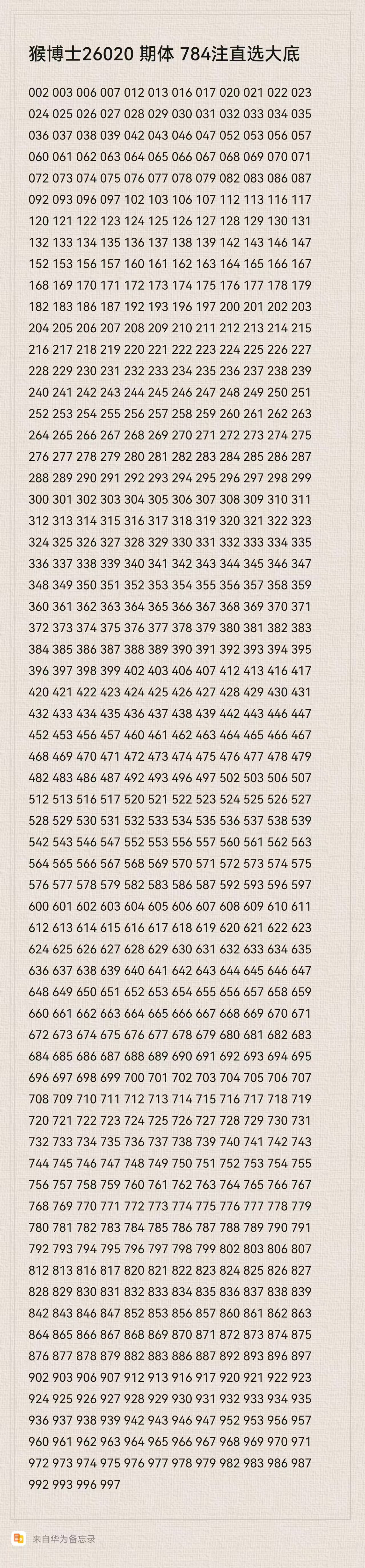猴博士26020期排列三784注直选大底:(可以当母底用,然后进行缩水)