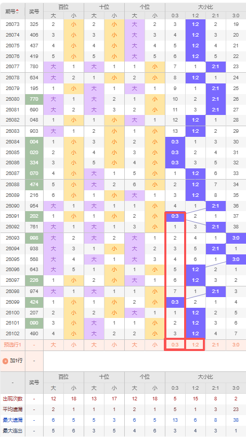 上期大小比:1:2,近10期大小比出现情况:3:0、2:1、3:0、1:2、1:2、2:1、0:3、1:2、1:2、1:2,最近10期出2期2:1,出现5期1:2,出现1期0:3,出现2期3:0,根据近10期出号规律本期推荐遗漏3期的0:3,防四连出1:2,综上所述大小比推荐:1:2,重点关注:0:3。