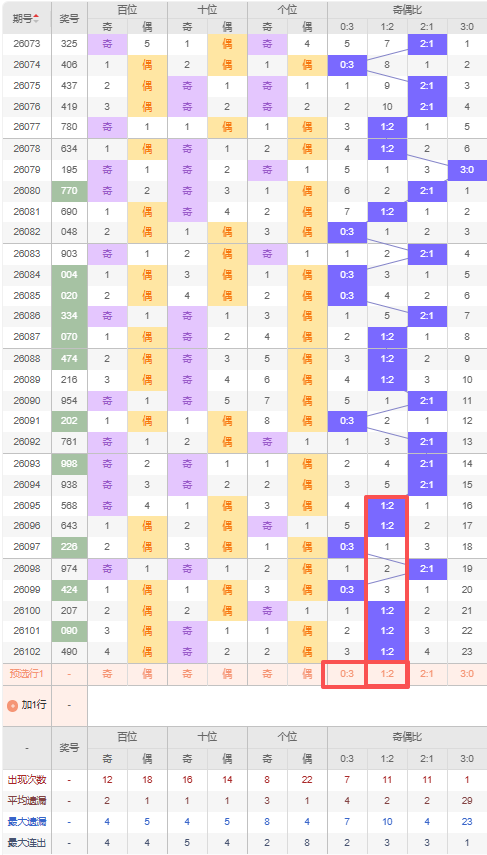 上期奇偶比:1:2,近10期奇偶比出现情况:2:1、2:1、1:2、1:2、0:3、2:1、0:3、1:2、1:2、1:2,最近10期出现3期2:1,出现5期1:2,出现2期0:3,出现0期3:0,根据近10期出号规律本期推荐四连出1:2,防遗漏3期出0:3,综上所述奇偶比推荐:0:3,重点关注:1:2。