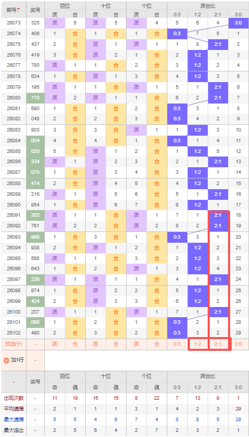 上期质合比:0:3,近10期质合比出现情况:0:3、1:2、1:2、1:2、2:1、1:2、1:2、2:1、0:3、0:3,最近10期出现2期2:1,出现5期1:2,出现3期0:3,出现0期3:0,根据近10期规律本期推荐遗漏2期出的2:1,防遗漏3期出1:2,综上所述质合比推荐:1:2,重点关注:2:1。