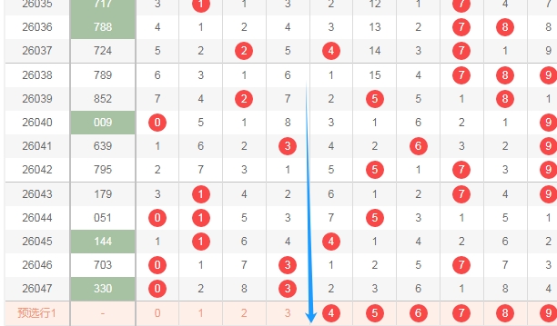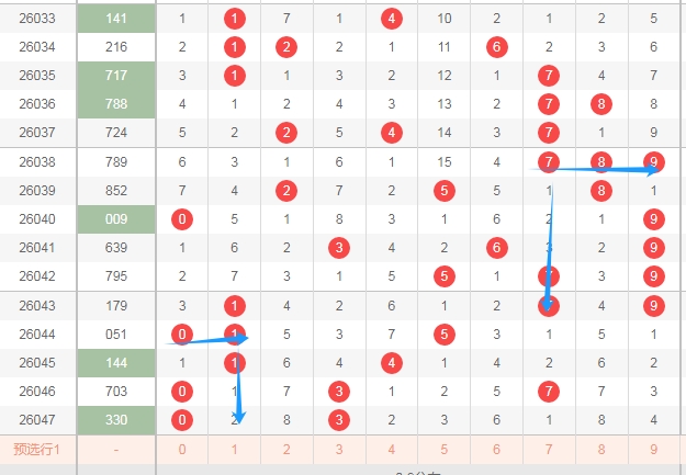 我在上面体彩排列三开奖号码走势分布图中标注出来的蓝色大箭头,你们看看蓝色大箭头右边的数字最近是不是开出的数字少,最近两期只出现了一个数字,这个区域的数字有456789一共有6个数字,那么本期这6个数字至少要关注出一个或者两个。