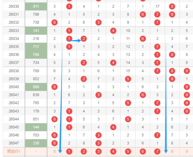 我在上面体彩排列三开奖号码走势分布图中标注出来的蓝色大箭头中间这个区域的数字1234567,最近十几期没出现过连号组合,上次出现连号组合还是上面出现数字12组合,这个区域的连号组合有12 23 34 45 56 67一共有6组,那么本期可以关注这个区域出连号组合。