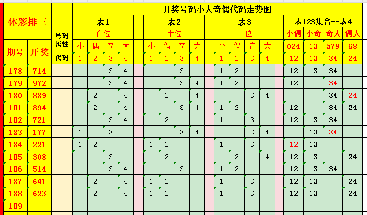 首先把0123456789十个开奖数字,按照数字的“小大奇偶”属性,设定与1234相对应的代码即:小数01234代码为“1”;偶数02468的代码为“2”;奇数13579的代码为“3”,大数56789的代码为“4”;根据以上规则,并依据开奖号码分别搭建出百位、十位、个位的“小大奇偶”代码走势图,分别见表1表2表3表4,具体表述如下: