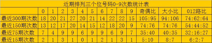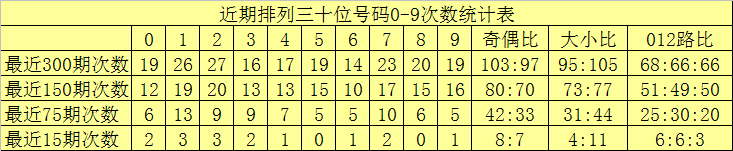 最近15期奖号由冷到热表现为:3、6→0次,4、7、9→1次,0、1、5→2次,2、8→3次,奖号奇偶比为6:9,大小比为7:8,012路比为3:4:8。