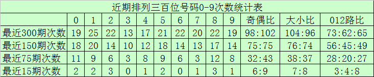 百位分析:最近300期奖号由冷到热表现为:3→22次,0、9→26次,4、5→28次,6→30次,7→31次,8→34次,2→35次,1→40次,奖号奇偶比为147:153,大小比为149:151,012路比为104:99:97。