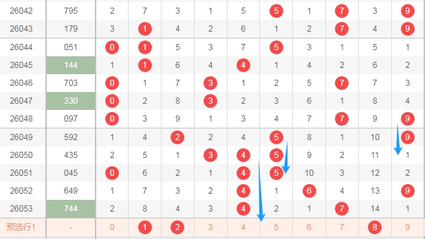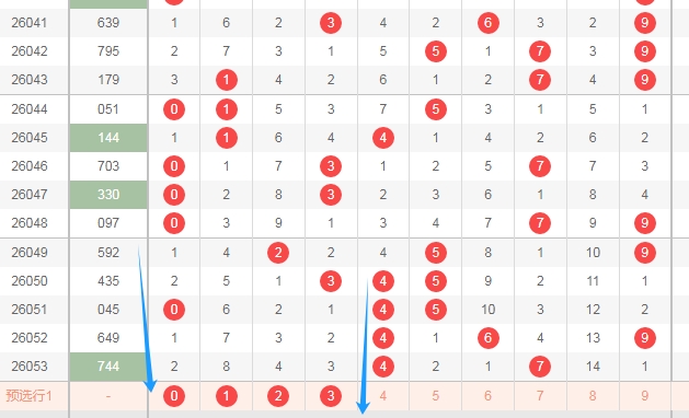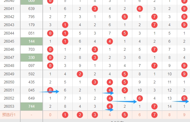 上图是体彩排列三开奖号码走势分布图,我在上面走势图中标注出来的数字都是质数数字12357,上面走势图中标注出来的蓝色小箭头表示最近开出的合数数字,上期出两个合数一个质数组合,上上期开出全合数组合,最近三期开奖号码中合数比质数多,那么本期质数数字12357至少可以关注出一个或者两个吧。