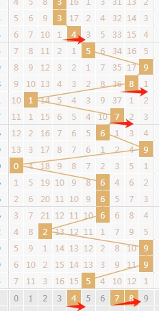 上图是体彩排列三和值尾数走势分布图,我在上面走势图中标注出来的4尾数遗漏了15期上次遗漏了17期,和值7尾数遗漏了10期上次遗漏了37期,和值8尾数遗漏了12期上次遗漏了17期,那么按照这个遗漏周期分析的话,这三个和值尾数本期或者近期都可以留意留意。