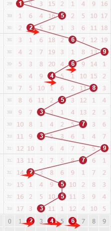 上图是体彩排列三和值尾数走势分布图,我在上面走势图中标注出来的跨度2遗漏了3期上次遗漏了11期,跨度4遗漏了11期上次遗漏了20期,跨度6遗漏了12期上次遗漏了1期,那么根据这个遗漏情况,本期或者近期这三个跨度都可以关注关注。