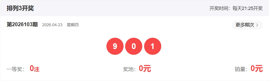 排列三第2026103期开奖回顾:开奖号码:901 形态:组六