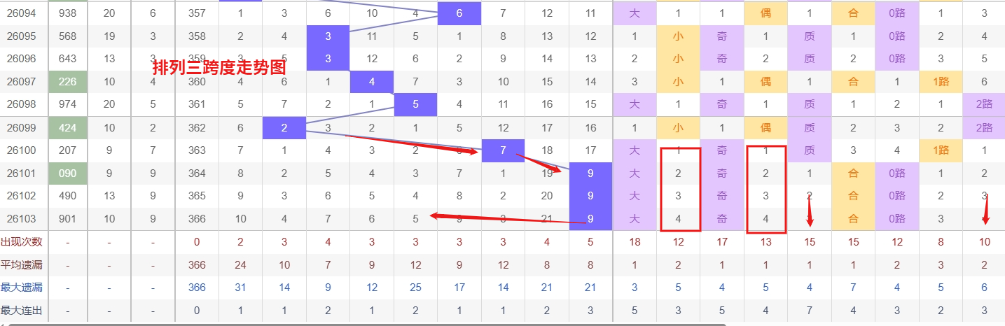 排列三 跨度分析:从上图可以看出近100期的跨度大小比约为54比46,跨度奇偶比约为47比53总体来看还是比较均衡的,但跨度大小之间有点差异。我们再从历史开出9跨后下一期4跨度数据来做参考。最近10期跨度大小比约为6:4期开出小数跨度过多返回大数跨度的概率更高一点。历史开奖近2期出9跨以后的走势为008期开出9跨后下一期走6跨走出3振幅,第020期开出9跨后下一期走4跨走5振幅第080期开出9跨后下一期开出8跨走出1振幅。连续多期大振幅,近期排列三跨度走势中,6跨作为温号,近期出现频率有所提升,已显露出逐步转热的迹象,温号一旦打破平衡往往容易顺势走热,接下来需重点关注热度能否进一步延续。与此同时,8跨则属于当前较为明确的热号,近期表现活跃且具备较强的连下惯性,在跨度区域仍有继续出现的可能,同样不可忽视。跨度走出2到5个振幅看好的跨度有4568跨,所以第2026104期排列三跨度推荐4568跨。