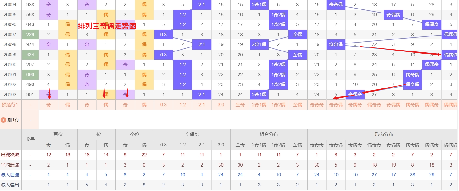 排列三 奇偶分析:从上图可以看出排列三100期内百位奇偶比约为47比53,十位奇偶比为51比49,个位奇偶比为55比45,十位的比值比较均衡,但是个位的比值偏差就有点大,历史奇偶形态近2期开出奇偶奇后下一期的走势为,第015期开出奇偶奇后016期开奇奇偶, 第021期开出奇偶奇后第022期开偶奇奇,第042期开出奇偶奇后第043期开奇奇奇,近期排列三奇偶走势中,奇奇奇冷态,已遗漏30期未出,从冷热均衡与回补规律来看,其出现概率正在逐步累积,近期有较大概率迎来反弹,需重点防范这一冷态组合的突然现身。与此同时,奇奇偶则属于当前较为活跃的热号,近期表现稳定且具备一定的连下惯性,在奇偶形态中仍有继续走强的可能,所以排列三2026104期奇偶形态推奇奇偶与奇奇奇。