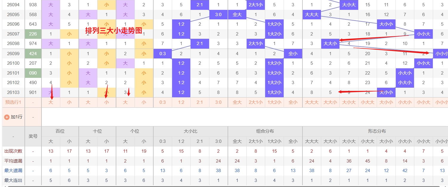 排列三 大小形态分析:从大小走势图上可以看出排列三100期内百位大小比约为54比46,十位大小比约为48:52,个位大小比约为55比45,除了个位和百位奇数比偶数多,十位偶数比奇数多。历史数据近2期开出大小小下一期的走势为,第003期开大小小后第004期开小大大。第012期开出大小小后第013期开大小大,第031期开出大小小后032期开小小大。近期排列三大小走势中,小大大与大小大两种形态均处于冷态,两者遗漏值已累积较长时间,从冷热均衡与概率回归的角度来看,长期未出往往意味着回补窗口正在逐步打开,接下来有较大概率出现反弹,需作为重点防范对象。这两种冷态组合虽然结构不同,但共同反映了近期大小搭配中偏态累积的释放需求,所以排列三第2026104期大小形态推荐小大大防大小大。