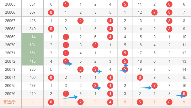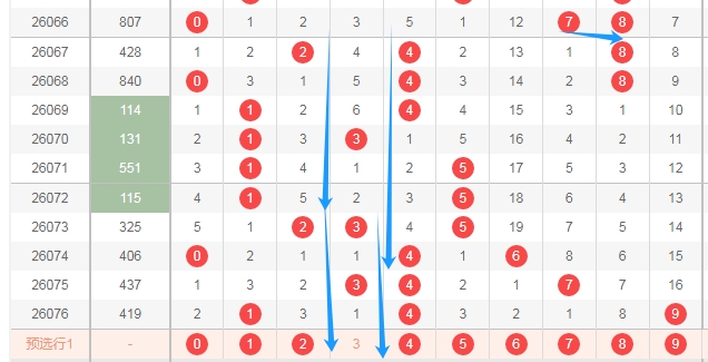上图是体彩排列三开奖号码走势分布图,我标注出来的数字都是偶数数字02468,标注出来的蓝色小箭头都是奇数数字,最近两期又开出了4个奇数数字,最近十几期开出的奇数多,那么本期偶数数字02468关注出1个或者2个,防3个。
