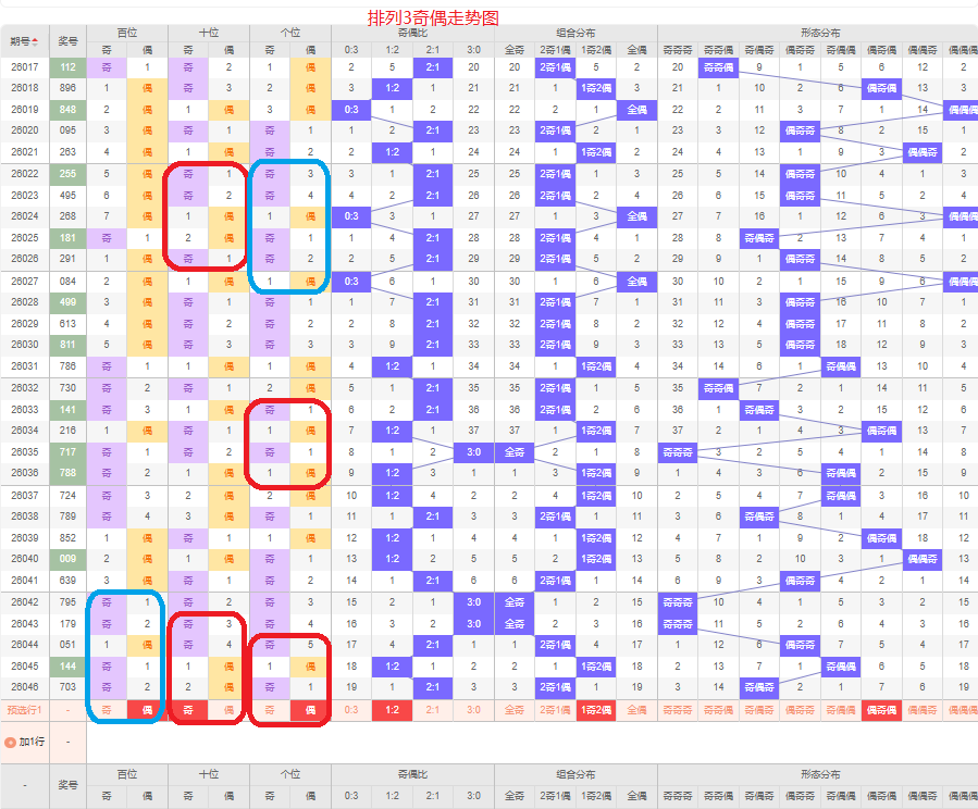 上一期的奇偶比为2:1,两奇的号码组合,从近五期的奇偶数出现情况看,奇数出11次,偶数出现4次,奇数号码出现较多,本期要侧重两偶的号码组合,侧重偶奇偶或奇奇偶的号码组合,根据奇偶组合形态可做五码定位02468/13579/02468或13579/13579/02468