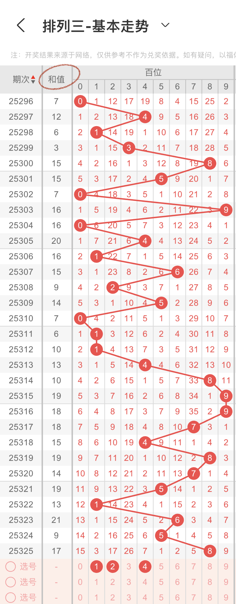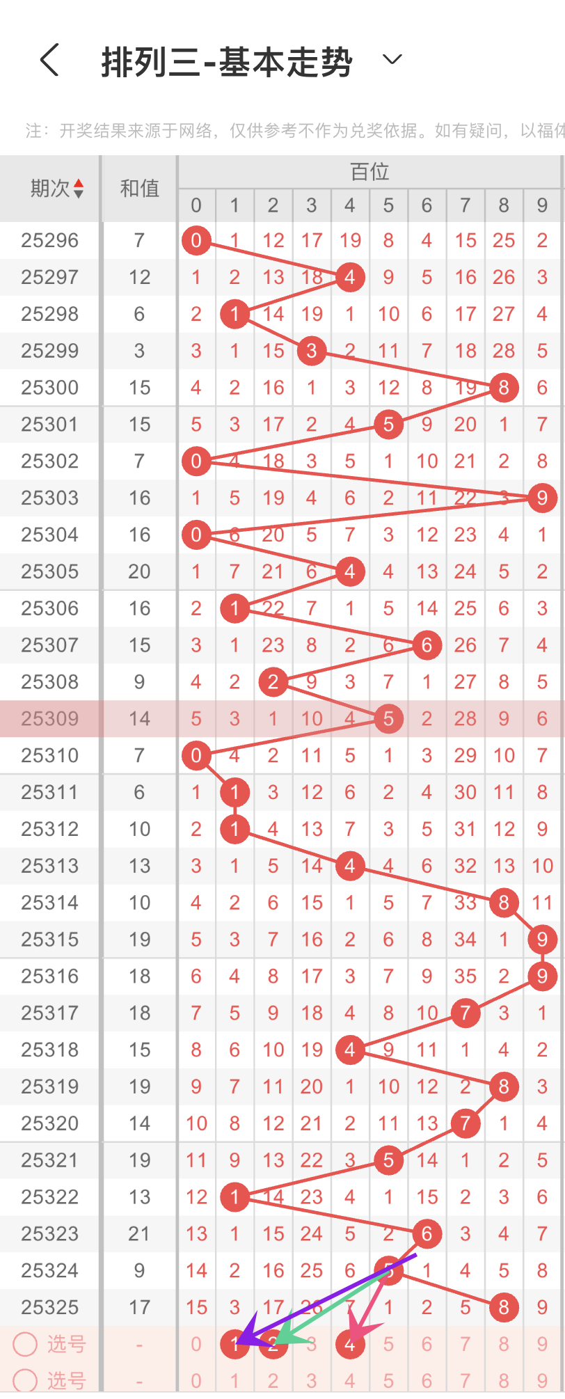 结合上面的大小、奇偶以及012路比,我们可以得到的数据分别是第一组01234,第二组02468,第三组258,我们重点选择3组数据中重复的,那百位我们选择2,防1路的14,综上所述百位选124