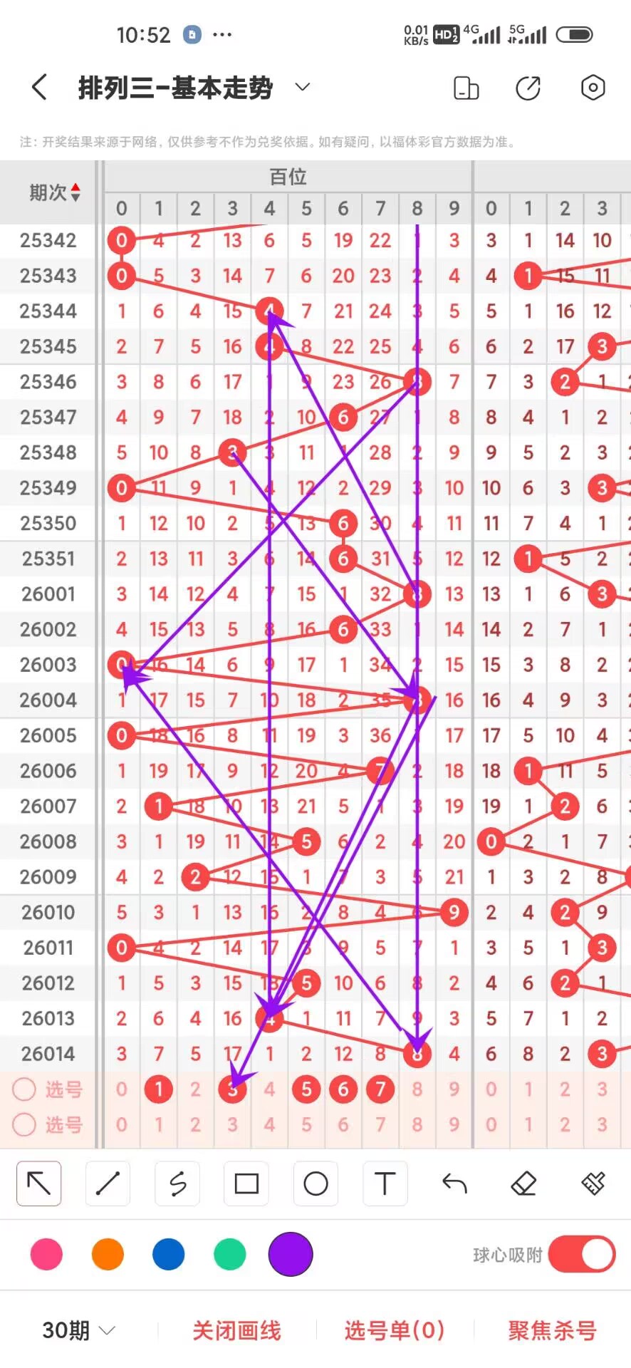2026015期,上期百位开出偶数8,我们通过走势图来看300期012路中下号的数据,0路号码的最大总数是107次,0369分别在300期内下号分别是26,22,31,28,这几个号码差别不大,我们再来看1路号码最大总数是99,147号码分别是,40,28,31,4下号次数最少28次,再回过头来看2路号最大总数是94次,258号码分别是33,28,33次,这三个数之间差别不大,在来看百位平均遗漏,目前0路遗漏的总数是33次,1路遗漏的总数是26,2路遗漏总数26,百位目前2路下号热度高,我们可以关注下,通过上面的走势分析我们可以看出目前百位大号码走势比较好,36号码走势就有点冷淡,今天百位我们重点关注13567,具体看下面走势图