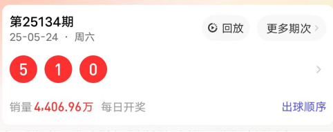2025134期开奖号码为510,奇偶值为2奇1偶;大小值为1大2小;012路走势为012路;跨度为5跨;和值6点;组六形态。
