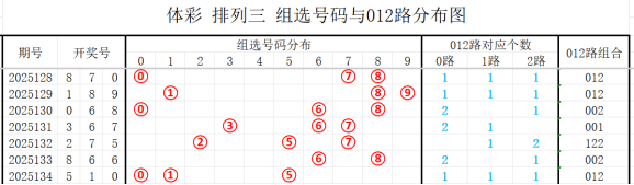 近7期(128~134)开奖号与012路组合分别为870(012)、189(012)、068(002)、367(001)、275(122)、866(002)、510(012),上期开奖号为012路组合,根据整体走势分析,本期看好的012路组合有:002、001、012、011,防000、022、112路组合。