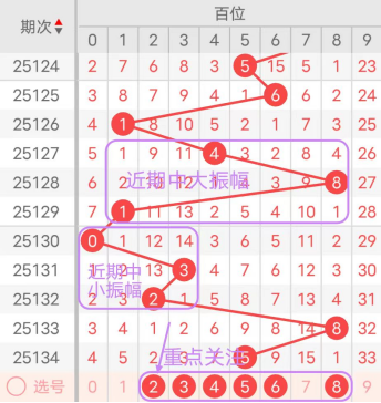 近7期(128~134)开奖号百位号码球分别为8、1、0、3、2、8、5,开奖号与上一期走出的振幅分别为4、7、1、2、1、6、3。128期走出8号大数号码球,走出“4”的中小幅度,129期走出1号小数号码球,走出“7”的大幅度,130期走出0号小数号码球,走出“1”的小幅度,131期走出3号中小数号码球,走出“3”的中小幅度,132期走出2号小数号码球,走出“1”的小幅度,133期走出8号大数号码球,走出“6”的中大幅度,上期走出5号中大数号码球,走出“3”的中小幅度;从振幅大小及走势图的整体形势来看,中大幅度走在3~4之间较为适宜,中小幅度走在0~2之间较为适宜;结合走势图的整体及大小走势分析,本期百位需重点关注号码球为2、3、4、5、6、8。